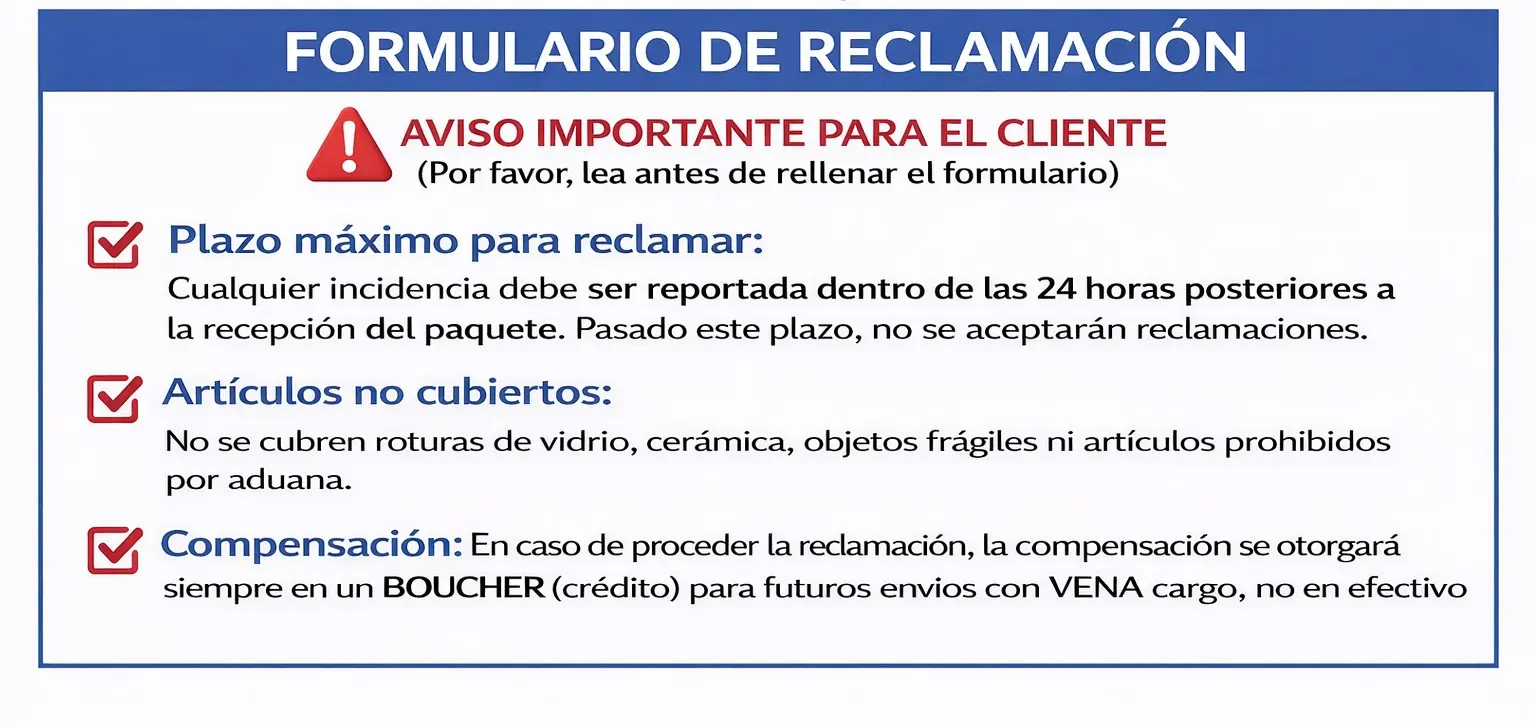 Compensación: En caso de proceder la reclamación, la compensación se otorgará siempre en un BOUCHER (crédito) para futuros envíos con VENA cargo, no en efectivo.
